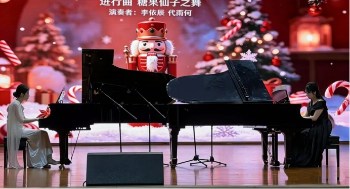 演播大厅内,两台三角钢琴对面摆放,简约而不失雅致,为这场音乐之约奠定了温馨而专业的基调。音乐会曲目丰富多元,涵盖中外经典佳作,从张朝《皮黄》《哈尼情歌》、王建中《山丹丹开花红艳艳》等中国民族风格作品,到柴可夫斯基《胡桃夹子》组曲、舒伯特A大调奏鸣曲等西方经典曲目,再到拉赫玛尼诺夫、李斯特等大师的经典之作,每一首都被学子们演绎得淋漓尽致。