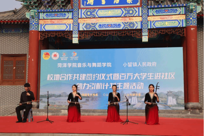 12月19日,菏泽学院音乐与舞蹈学院与小留镇人民政府共建“实践教学基地”与“大学生就业创业实践基地”签约暨揭牌仪式成功举办,并同步启动音乐与舞蹈学院“百万大学生进社区”活动。音乐与舞蹈学院党委书记李谨辰,党委副书记宋艳,团委书记马蕊,教师郑子瑜;牡丹区委副书记、二级调研员陈居祥,小留镇党委书记张立杰,党委副书记、镇长马孝欢,共青团牡丹区委员会副书记张朝,小留镇党委副书记孙庆博参与活动。