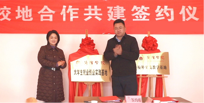 签约揭牌仪式由小留镇党委副书记、镇长马孝欢主持。张立杰详细介绍了小留镇的产业布局与企业资源,并表示将充分发挥区域产业优势,深化整合校地资源,以务实举措聚力育人。李谨辰介绍了音乐与舞蹈学院的办学理念以及学院在专业建设、人才培养与社会服务等方面的成果,强调此次合作将充分发挥双方优势,通过资源互补实现人才培养与地方发展的双向赋能。在现场嘉宾的见证下,李谨辰与张立杰共同签署合作协议,并为“菏泽学院实践教学基地”“菏泽学院大学生就业创业实践基地”揭牌。